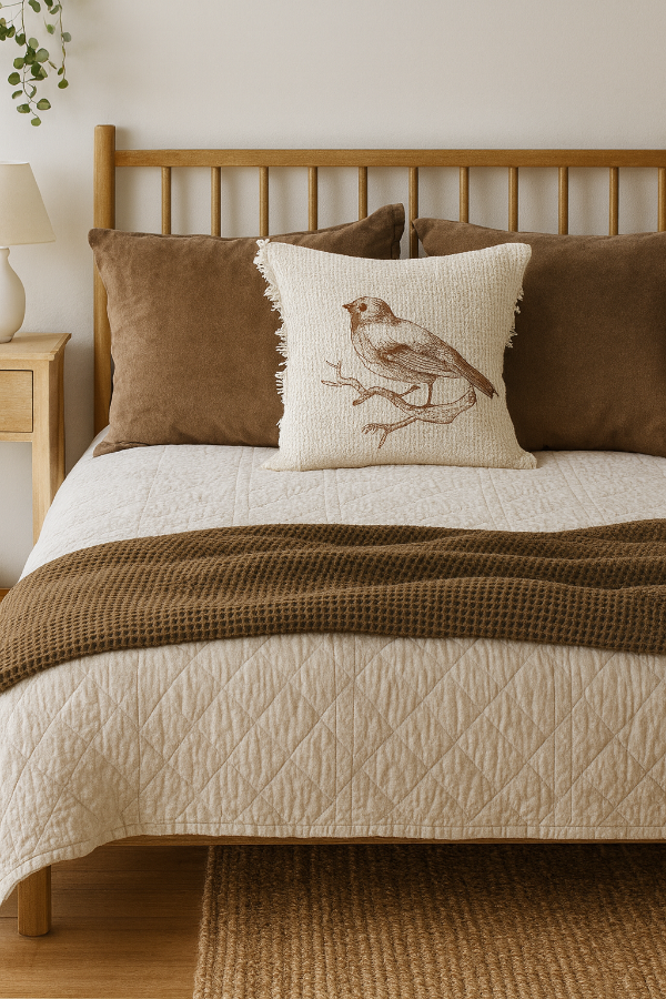 El set incluye 2 almohadones Bucle chocolate de 45x45 cm + 1 almohadón Nido crudo con estampa pájaro 40x40 + 1 manta nido abeja chocolate de 2.00x1.40 cm